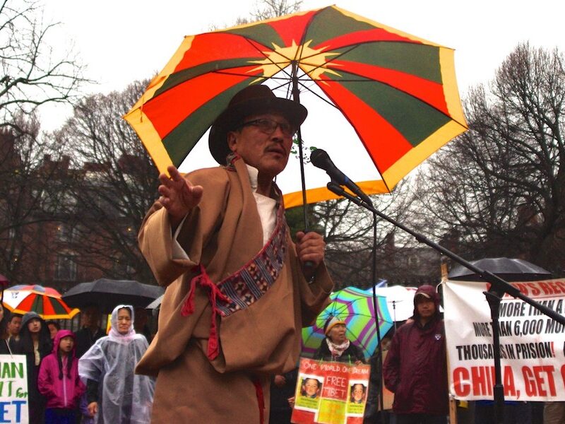 Lhadolma Sherpa wasn’t bothered by the rain on Boston Common as she led fellow Tibetans in chants of “China lies, Tibetans die” and “China lies, the UN listens.”