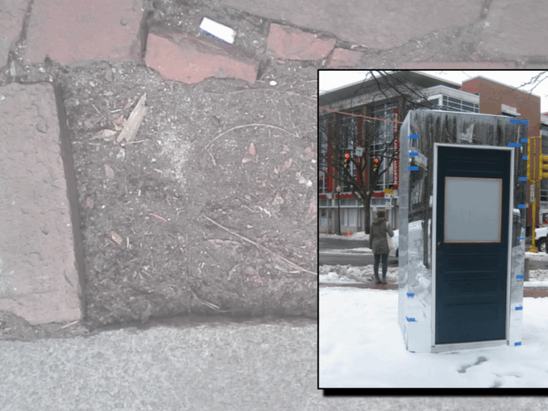 Around Christmastime, a mirrored box the size of a telephone booth appeared on Davis Square’s Statue Plaza. People wondered what it was—a bathroom? A maintenance shed? A TARDIS? There was a wooden door on one side, though you wouldn’t see it if you approached the box from Elm Street, Highland Ave, or Holland Street. If you tried to open the door, you would find it pushed inward just a few inches, not enough to enter the structure, and a light inside turned on.