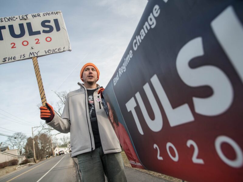 Despite outpolling Yang, Steyer, and Patrick in New Hampshire, Gabbard was omitted from the CNN roster. The congresswoman is also three points ahead of Patrick in national polls, all the more reason her backers showed up at Saint Anselm.