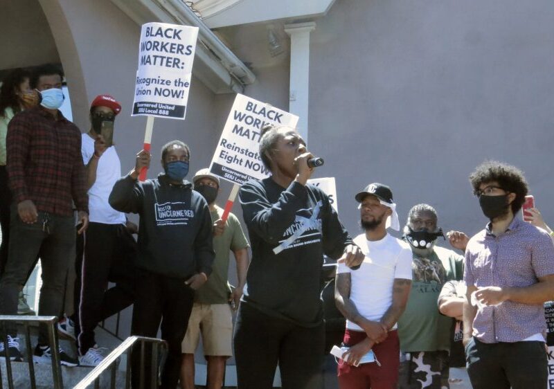 More than 50 people turned out to an otherwise quiet city neighborhood with megaphones and dozens of “Black Workers Matter” signs to hear speakers, chant slogans like “Boston is a union town,” and then march down Dorchester Avenue.