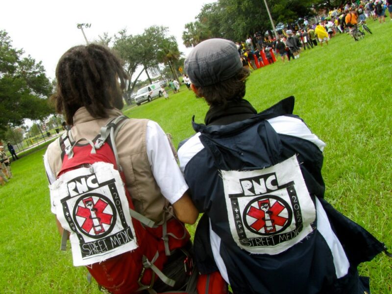 Operating autonomously from the state, education for a lot of today’s street medics has been created and standardized through informal mutual aid networks over decades. Ann Hirschman, a licensed nurse practitioner known as the ‘grandmother of street medics,’ authored some of the earliest training programs. There are plenty of resources for street medic indoctrination: Do No Harm Coalition, founded by Dr. Rupa Marya, professor of medicine at University of California, San Francisco; Paper Revolution; Riot Medicine; Street Medic Handbook by Chicago Action Medical; books like “Where There Are No Doctors” by David Werner; zines like “We Take Care of Each Other” by Pittsburgh Street Medics.