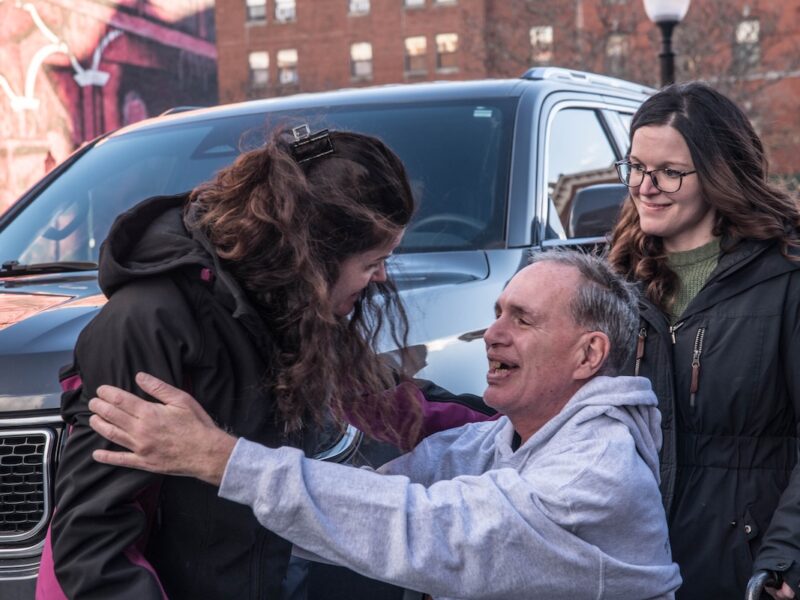 At 3:58 PM, Carver emerged from the elevator on the first floor. His lawyers and relatives joined him, with his daughter pushing his wheelchair. Now wearing a gray hooded sweatshirt with the logo for the CPCS Innocence Program, he smiled. The other supporters, who had lined up in the hallway, clapped for him. He kissed one of them on the cheek, shook hands with others, and shared a long hug with his ex-wife, Dempsey. And then Verzi wheeled her father through the doorway to freedom.