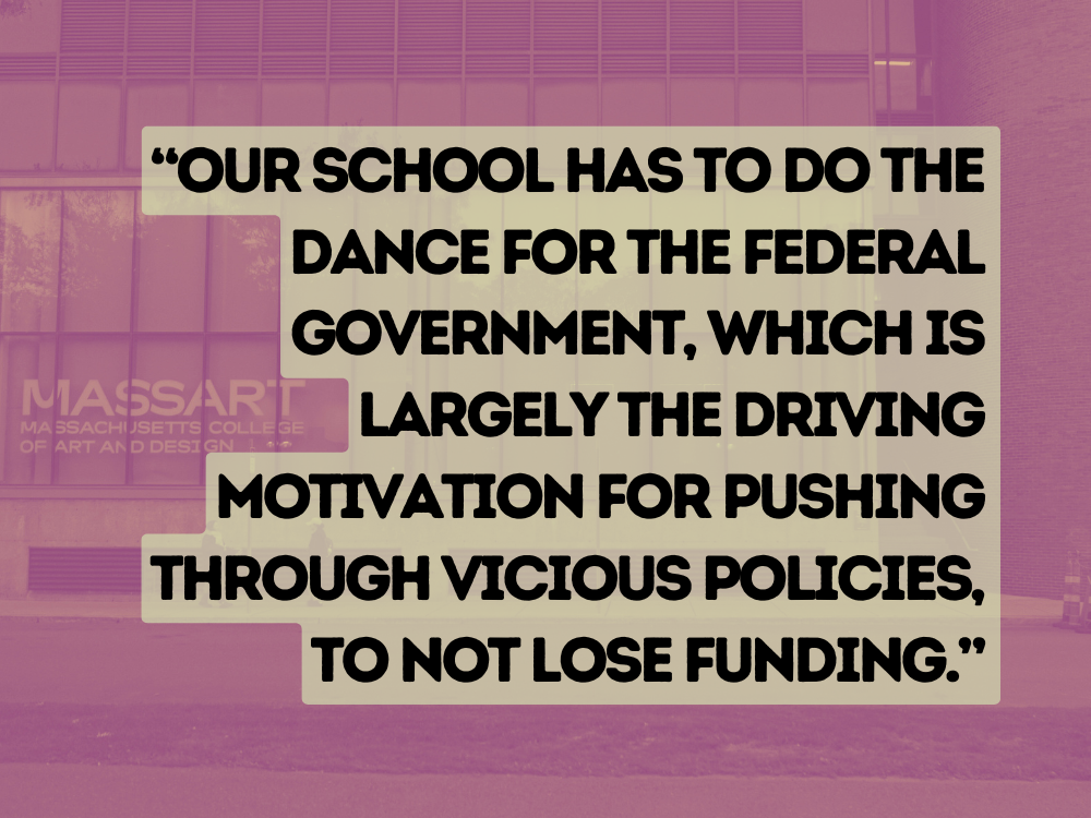 “In some ways, the school is sleepy and cool and progressive and not as repressive [as other schools],’ Watts said. Although MassArt implemented a punitive protest policy, it had no encampments—unlike nearby Northeastern University—in part because it engaged in dialogue with activists, Watts said. “But that just means that our organizing got further, and then met an edge that was further along than other schools,” they said. “But there still is an edge.”