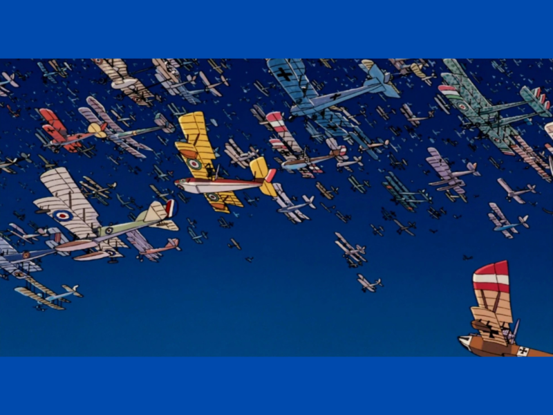 He talks about being a pilot in the Italian air force on a routine patrol in the last summer of World War I. His unit suddenly finds themselves in a fight for their lives with an Austro-Hungarian unit. He’s the only Italian to survive and is still flying for his life when he has a vision of his plane flying itself above thick clouds. Far above him, he sees a sparkling band of white arcing across the sky into infinity. Then the pilots from both sides who he had just seen die fly past him toward the white band, not saying a word, staring straight ahead. Including his best friend. And he shouts to his friend that he wants to take his place; so his friend can go back to the woman he just married. But Porco’s plane won’t respond. And he realizes that the white band is made up of a vast number of planes from all nations. All killed in the war.