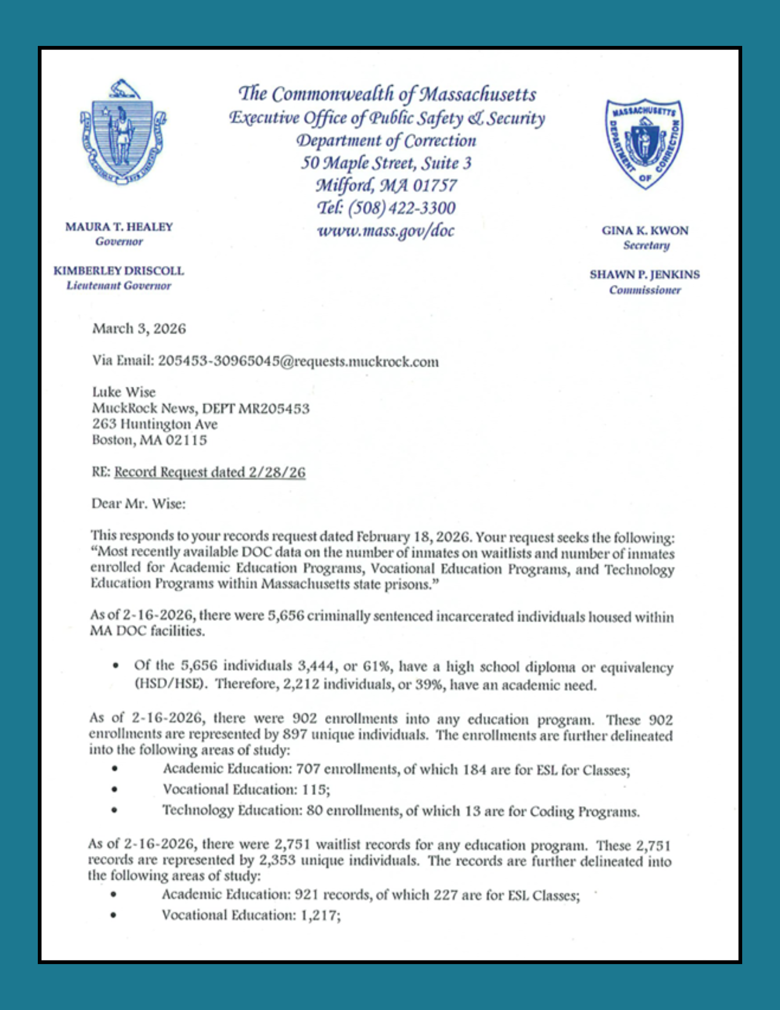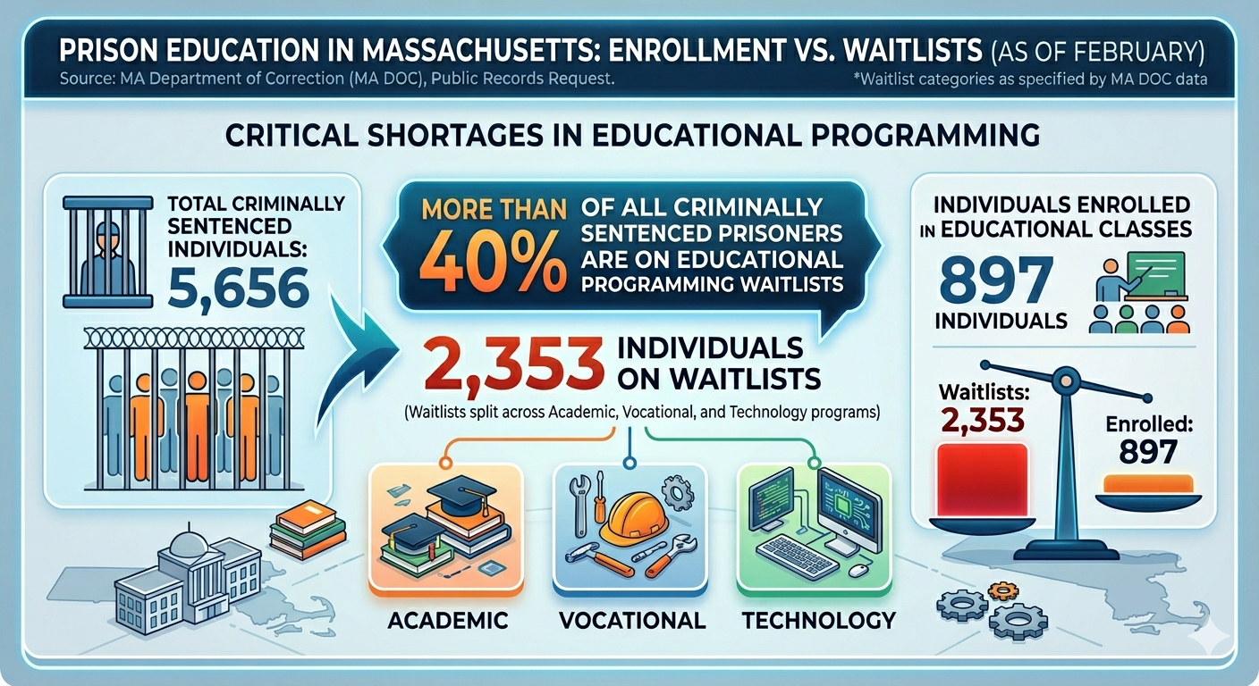 According to data obtained through a public records request filed with the Massachusetts Department of Correction, as of February, there were 2,353 individuals on waitlists for educational programming in Massachusetts prisons, split across academic, vocational, and technology programs. At the same time, there were just 897 individuals enrolled in educational classes.