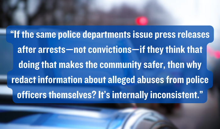 “If the same police departments issue press releases after arrests—not convictions—if they think that doing that makes the community safer, then why redact information about alleged abuses from police officers themselves?”