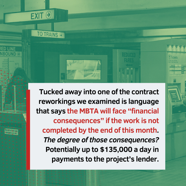 Tucked away into one of those reworkings is language that says the MBTA will face “financial consequences” if the work is not completed by the end of this month. The degree of those consequences? Potentially up to $135,000 a day in payments to the project’s lender.