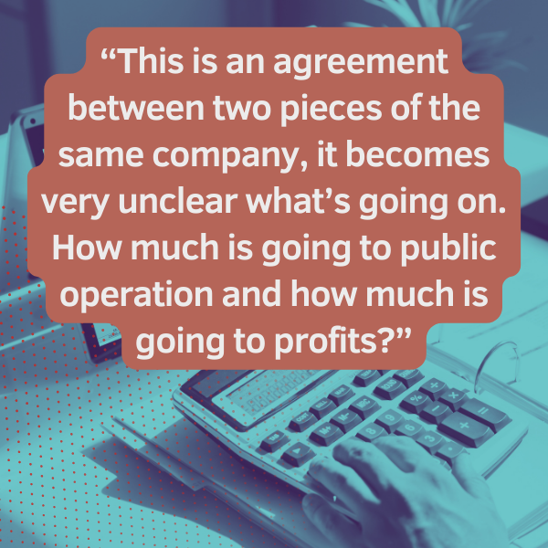 “They’re both [the] financing body and operations body,” Habibi said. “It seems like they’re contracting with themselves to do some of the actual work. This is where it becomes really opaque and becomes really hard to see what is actually going on. … If the operations and maintenance subsidiary is sending invoices to the larger company, who is to say what kind of overhead they’re charging, what profit they’re charging? This is an agreement between two pieces of the same company, it becomes very unclear what’s going on. How much is going to public operation and how much is going to profits?”