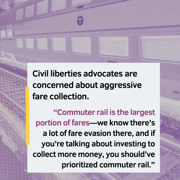 “For people who touted this system as a way for the MBTA to do a better job collecting fares, they’re not being smart on return on investment,” Thompson said. “You have to spend a lot more money on equipment you’re putting on buses in order to collect a lot less money. … Commuter rail is the largest portion of fares—we know there’s a lot of fare evasion there, and if you’re talking about investing to collect more money, you should’ve prioritized commuter rail.”