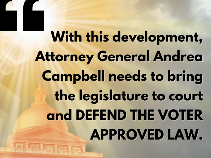 Craney continued, “Legislative leaders want to dig in and continue to violate the voter approved law. With this development, Attorney General Andrea Campbell needs to bring the legislature to court and defend the voter approved law.”