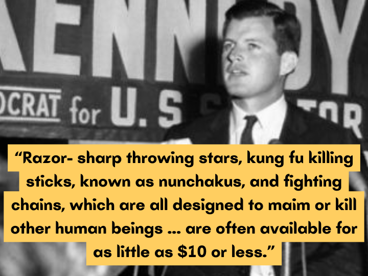 “Razor- sharp throwing stars, kung fu killing sticks, known as nunchakus, and fighting chains, which are all designed to maim or kill other human beings and which are often available for as little as $10 or less, continue to be shipped through the U.S. mail,” Kennedy said when he submitted his bill to ban mail order martial arts weapons.