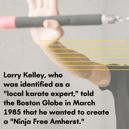 Larry Kelley, who was identified as a “local karate expert,” told the Boston Globe in March 1985 that he wanted to create a “Ninja Free Amherst” by banning kung fu weapons in the town.