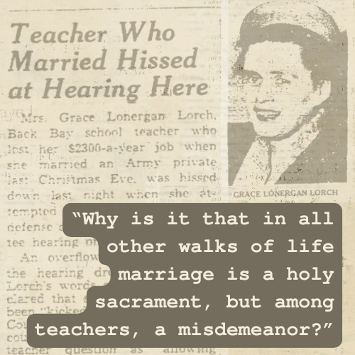 Still, Lonergan Lorch had her supporters, especially within unions like her own. The Boston Globe ran several “What People are Talking About” columns in which people defended her speech. Among them, Harvard Teachers’ Union President Albert Coolidge wrote, “Such a ruling by the School Committee is as foolish and hypocritical as it is unfair.” A Maine resident quoted Lonergan Lorch: “Why is it that in all other walks of life marriage is a holy sacrament, but among teachers, a misdemeanor?”