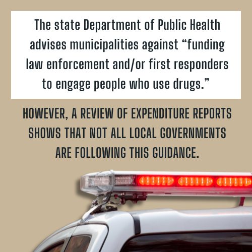 The state Department of Public Health advises municipalities against “funding law enforcement and/or first responders to engage people who use drugs (PWUD) through post-overdose outreach and/or other engagement efforts.” However, a review of expenditure reports shows that not all local governments are following this guidance.