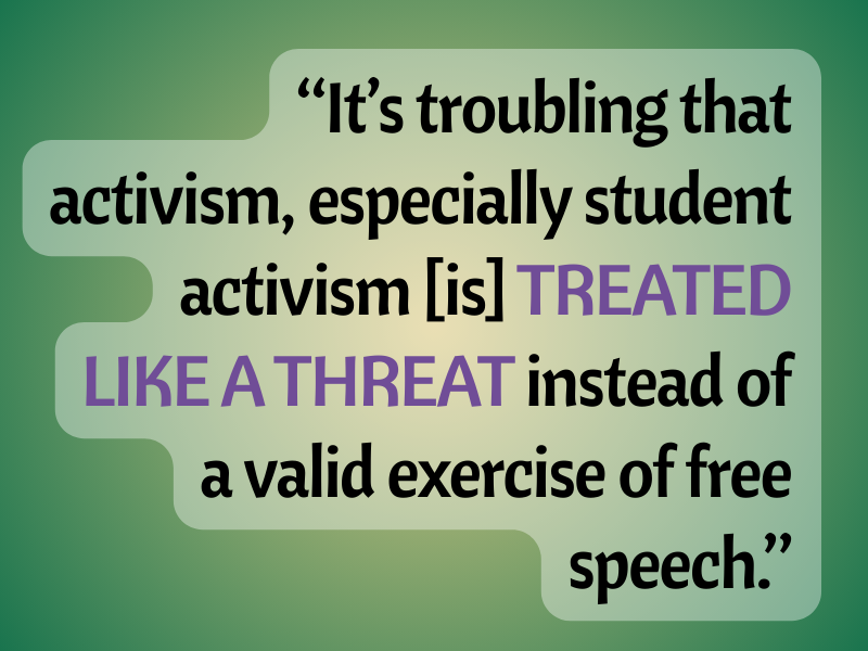 “Our encampment was a peaceful demonstration meant to call attention to the suffering in Gaza,” Zemlyansky said. “It’s troubling that activism, especially student activism—because there were listed student speakers—[is] treated like a threat instead of a valid exercise of free speech.”